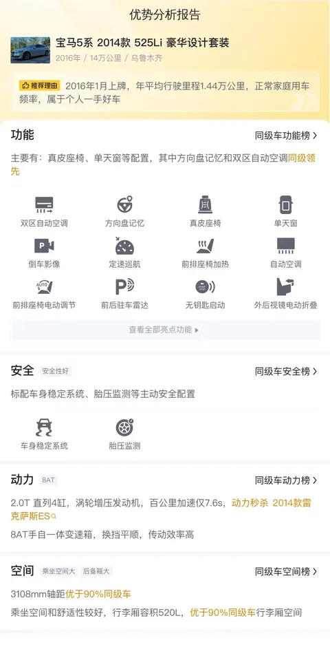 该车的具体版本是——宝马5系 2014款 525Li 豪华设计套装,上牌地为乌鲁木齐,上牌日期2016年1月,表显里程14万公里,新车指导价49.96万,二手车报价11.8万,过户次数0次。支持分期购车,首付3.5万即可开回家。