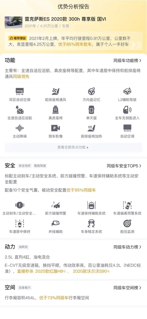 优势:雷克萨斯ES 2020款 300h 尊享版 国VI的配置挺丰富的,基本涵盖了日常所需,其中全速自适应巡航、车道居中保持也可以减轻行车压力。另外,因为是混合动力车型,所以油耗也比较低,4.2L的油耗,也低于2020款红旗H9。加上本身是中大型车,空间也比较宽敞。
