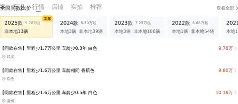市场行情部分,这辆车的售价10.58万,市场行情价8.93万-10.85万,价格合理,且本车是2025款中配车,配置丰富,车龄较小,预计再行驶2年后可卖7万,约折价25.6%,保值率较高。