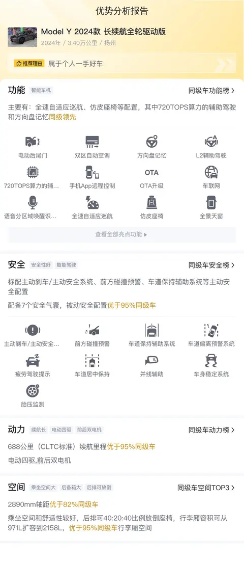 通过懂车帝的大数据分析,我们可以看到这辆二手Model Y 2024款 长续航全轮驱动版在配置、动力、空间等方面都表现不错,尤其是在动力和空间方面,它可以秒杀2024款沃尔沃XC60、2024款理想ONE等竞品车型。但是,作为一款新能源车,它的续航里程可能会受到气温、风向、湿度、驾驶习惯等因素的影响,而插混车的续航则更加稳定。而且,新能源车的自燃风险和电池衰减也是需要考虑的因素。因此,在购买之前,一定要充分了解并评估这些因素。
