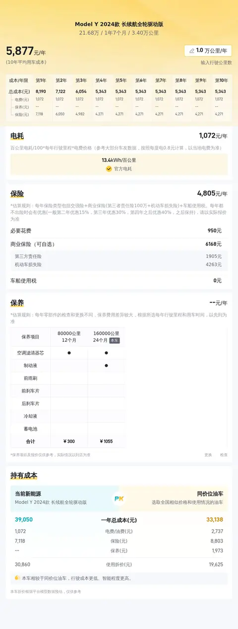 根据懂车帝的大数据分析,这辆二手Model Y 2024款 长续航全轮驱动版的10年平均用车成本大约是29055元/年,而同级油车的最低10年平均用车成本是57060元/年,最高是77729元/年,相比之下,它的用车成本要低很多,这也让车主可以更加轻松地应对日常用车的各种开支。