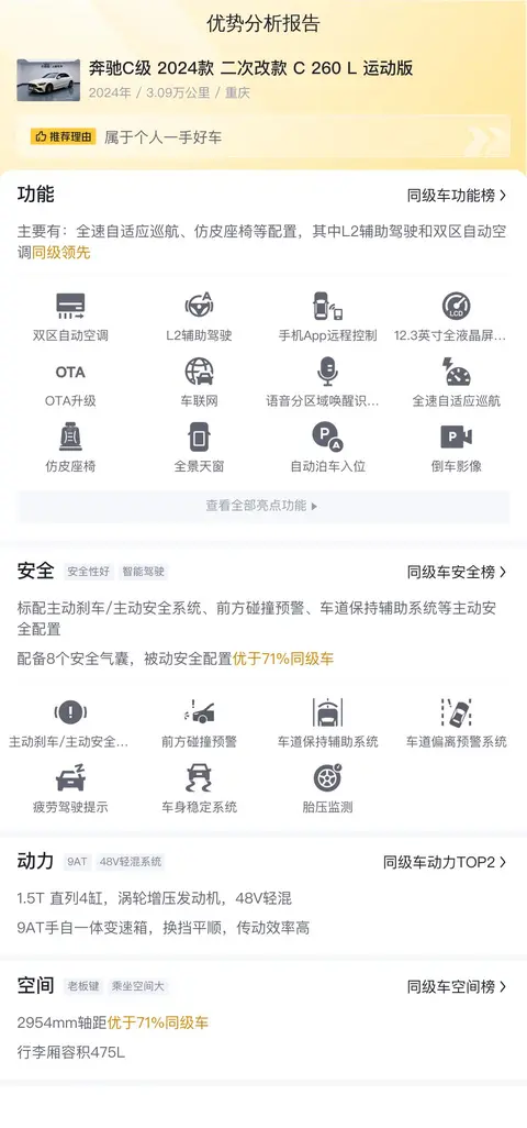 综上所述,奔驰C级作为一款集豪华、性能与舒适于一体的中型轿车,自问世以来便以其卓越的品质和独特的魅力赢得了全球消费者的青睐。它在豪华中型车市场中扮演着举足轻重的角色,它的豪华,在于精致的内饰、出色的乘坐舒适性以及丰富的配置;它的性能,在于动力系统的优异表现和精准的操控感受;它的舒适,无论是驾驶还是乘坐,都能感受到来自奔驰的精心调校和周到关怀。所有这些方面共同铸就了奔驰C级独一无二的市场地位。而这辆奔驰C级 2024款 二次改款 C 260 L 运动版,车况精良,且价格实惠,是一辆不可多得的好车,喜欢的朋友可以放心入手。