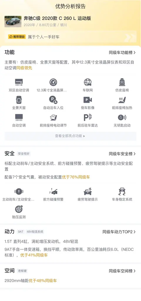 最后,我们还为您准备了该车在功能配置等方面的分析情况,帮助您更加直观的了解这辆车在同级别车型中的真实表现。