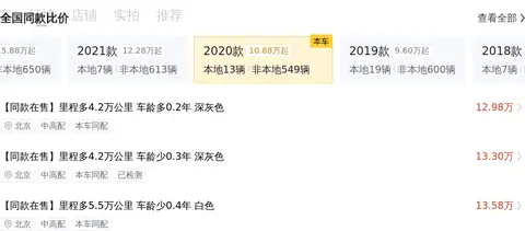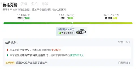 车况信息往往是购置二手车时的关键考量因素。就拿咱们正在看的这款车来说,它的里程数多于均值1.7万公里,车龄多于均值0.1年,过户次数少于均值0.4次,颜色为其他。基于这些车况信息,我们可以看到该车的当前报价为13.68万,在这样的车况下,价格适中,具有一定的竞争力。当然,具体的价格还需要根据车辆的实际状况和双方的协商来最终确定。