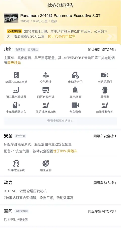 综合来看,这辆保时捷帕拉梅拉不失为一款集豪华、性能与舒适于一体的二手车选择。其合理的行驶里程、优良的车况,再搭配实惠的售价,对于追求驾驶乐趣与高端体验的消费者而言,尤其值得考虑。既能满足日常出行需求,又能在特殊场合展现车主品味与实力,是一款性价比较高的二手车。