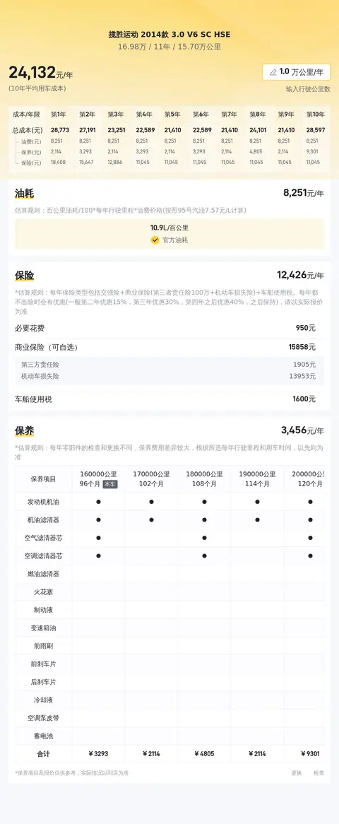 在用车成本部分,基于懂车帝对揽胜运动 2014款 3.0 V6 SC HSE的分析,该车型的平均用车成本约为24,447元/年,具体费用(按每年 2 万公里计算)包括燃油费约21,712元/年、保险费约6,917元/年、保养费约5,114元/年。需要注意的是,实际费用可能会因个人驾驶习惯、保险公司和保养项目的不同而有所差异。