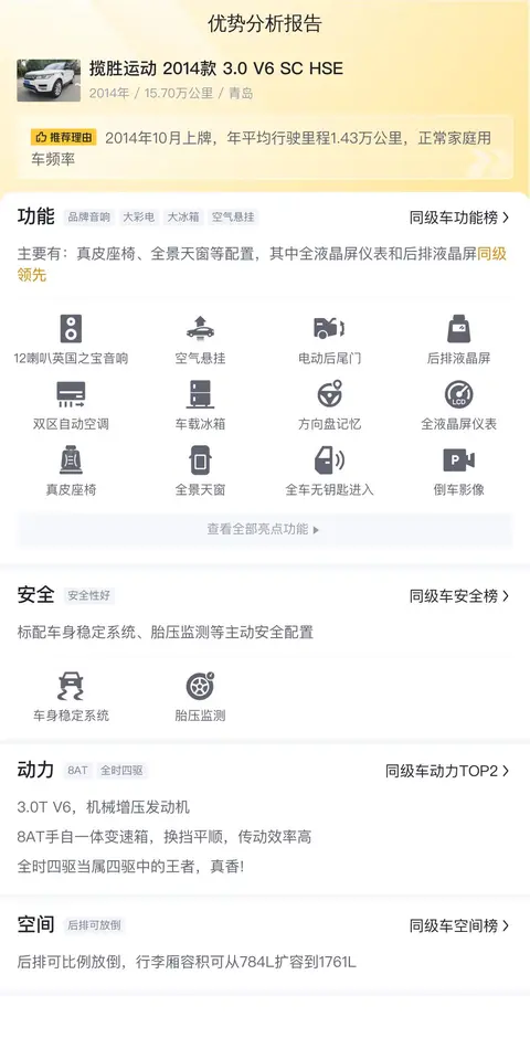 在功能配置部分,我们认为每一项配置都解决车主特定的用车需求。为此,针对揽胜运动 2014款 3.0 V6 SC HSE进行了深入的分析,旨在与同级车型进行对比,帮助识别其特有的功能配置。文件以图片形式提供,严禁转换为可文本。