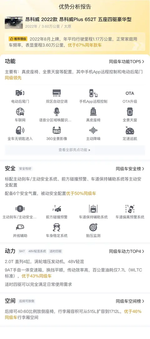 综上所述的新车含税价、用车成本、市场行情、优势分析、同款比价等数据仅供参考。在配置部分,因为二手车非标品,车辆可能会存在配置改装的情况,具体车况信息需要线下结合车辆实际情况进行综合参考。