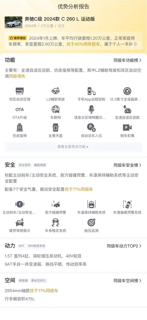 在竞争激烈的二手车市场中,辨识一辆车型的核心竞争力显得至关重要。接下来,我们将为您呈现这辆二手奔驰C级 C 260 L 运动版在关键性能指标上的表现,以便您能迅速洞察其竞争优势所在。无论您是追求极致的驾驶体验,还是注重日常使用的舒适与便捷,这份报告都将为您提供有价值的参考点,助您作出明智的选择。