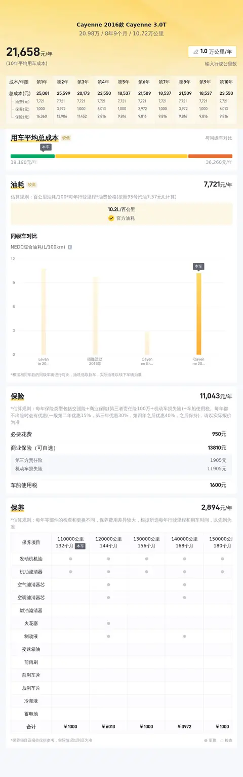 再来说说用车成本,Cayenne 2016款 Cayenne 3.0T的10年平均用车成本是22080元/年,而本车的10年平均用车成本是21655元/年,所以本车的用车成本比较低。
