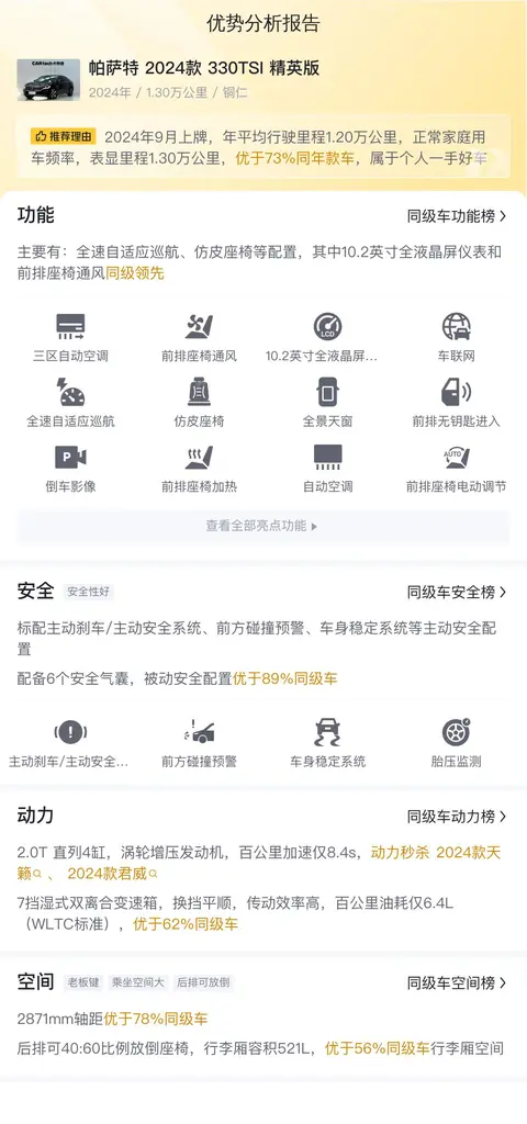 帕萨特作为大众汽车旗下的经典车型之一,一直以来都以其稳定的性能和合理的价格受到消费者的青睐。作为家用车,帕萨特2024款330TSI精英版车内空间宽敞,座椅舒适,无论是家庭出行还是日常通勤,都能为乘客提供良好的乘坐体验。搭载的2.0T发动机在保证充足动力的同时,也具有较高的燃油经济性,适合长期使用。综合来看,如果对这款车感兴趣,建议实地试驾,并查看车辆实际状况再做决定。