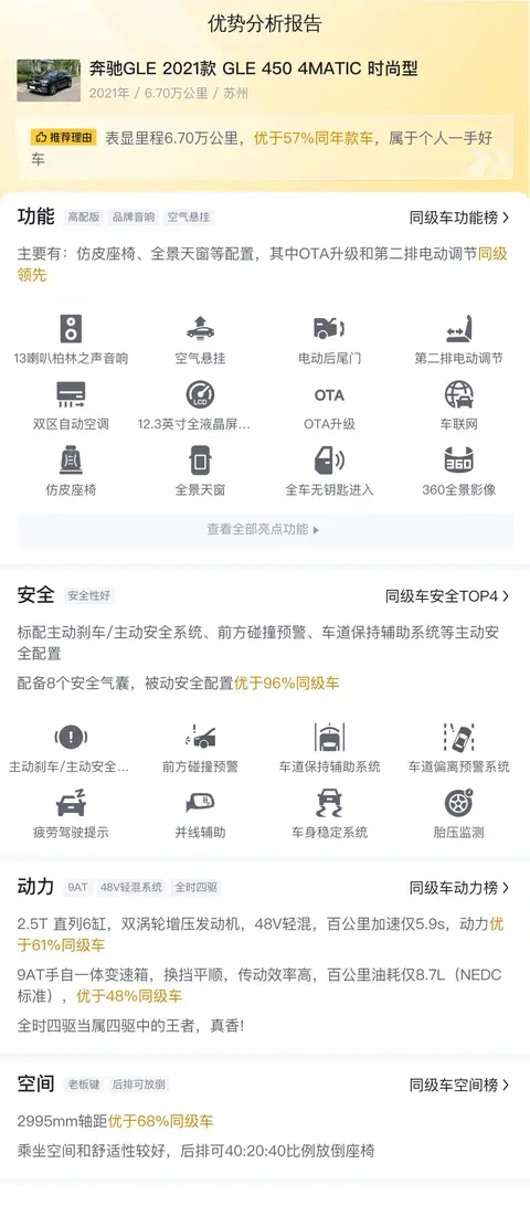 奔驰GLE能给人一种气势感,尤其适合那些喜欢越野,喜欢奔驰豪华,又不喜欢奔驰过于商务定位的用户选择,算是既有玩乐属性又有家庭属性还有商务属性的代表车型。今天这款二手的奔驰GLE整体来说还是很不错的,公里数不高,配置丰富,动力强劲,最重要的是价格够实惠,如今只要44.8万就能到手一辆奔驰大六座GLE,还是挺划算的!