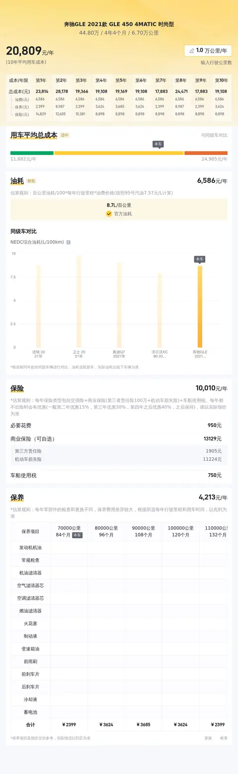据估算,奔驰GLE 2021款 GLE 450 4MATIC 时尚型的用车成本是21115元/年,动力强,同时用车成本也高。
