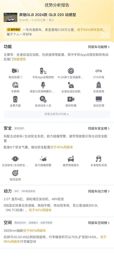 今天介绍的这款二手奔驰GLB2024款GLB220动感型上牌地为贵州遵义,上牌日期2024年12月,表显里程5.9万公里,新车指导价33.99万,目前二手车报价21.28万,过户次数0次,车辆能源类型为48V轻混系统,排放标准国VI。车身尺寸4638x1834x1696mm,轴距2829mm,座椅材质仿皮,天窗类型为分段式可开启全景天窗,行李舱容积可从703L扩容到1430L。动力方面,搭载了2.0T直列4缸,涡轮增压发动机,48V轻混,8挡湿式双离合变速箱,百公里油耗仅6.9L(WLTC标准)。亮点配置方面,配备了全速自适应巡航、仿皮座椅、手机App远程控制、电动后尾门等,其中手机App远程控制和电动后尾门同级领先。总体来说,这款二手奔驰GLB2024款GLB220动感型在车身尺寸、内部空间、座椅舒适度、动力性能、配置丰富度、智能互联、驾驶感受、乘坐体验、性价比等方面均表现出色,是一款值得推荐的中型SUV。