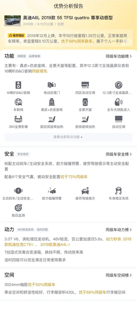今天我们要介绍的这款车,是2019年12月上牌的奥迪A6L 2019款 55 TFSI quattro 尊享动感型,车源地为合肥,上牌地是合肥,表显里程8.1万公里,新车指导价54.18万,二手车报价24.3万,车身颜色黑色,符合国VI排放标准。至今无过户记录。