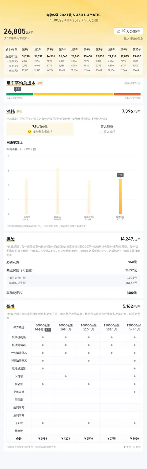 根据大数据分析,这款车的二手车市场价格在64.7万-78.77万之间,具体价格因车况而有所不同。养车成本方面,如上图所示,在百公里油耗8.4L的油耗水平下,该款车平均每年的养车费用大约26701元(按每年行驶1万公里计),实际费用支出视具体情况而定。
