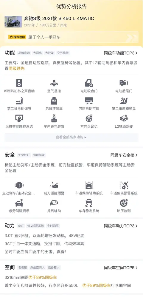这款奔驰S级配备了全速自适应巡航、真皮座椅等配置,其中L2辅助驾驶和车内香氛装置同级领先。安全性能上,标配主动刹车/主动安全系统、前方碰撞预警、并线辅助等主动安全配置,配备8个安全气囊,被动安全配置优于89%同级车。