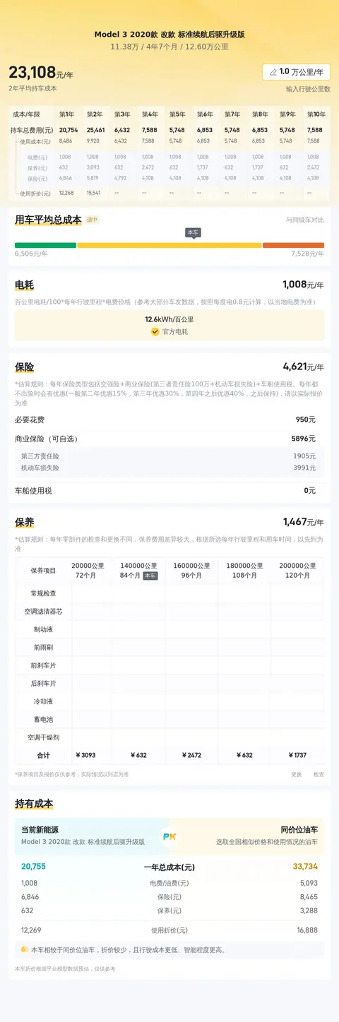 关于用车成本部分,根据估算,这辆Model 3的年均综合用车成本约为2.3万元左右。至于价格方面,在二手车市场,由于种种变量因素,价格波动实属常见。目前,这辆二手Model 3的售价设定在11.38万元,涵括过户费。若您资金暂时不充裕,分期付款亦是一种不错的选择,首付低至3.41万元,便可令您轻松享有这款车型。