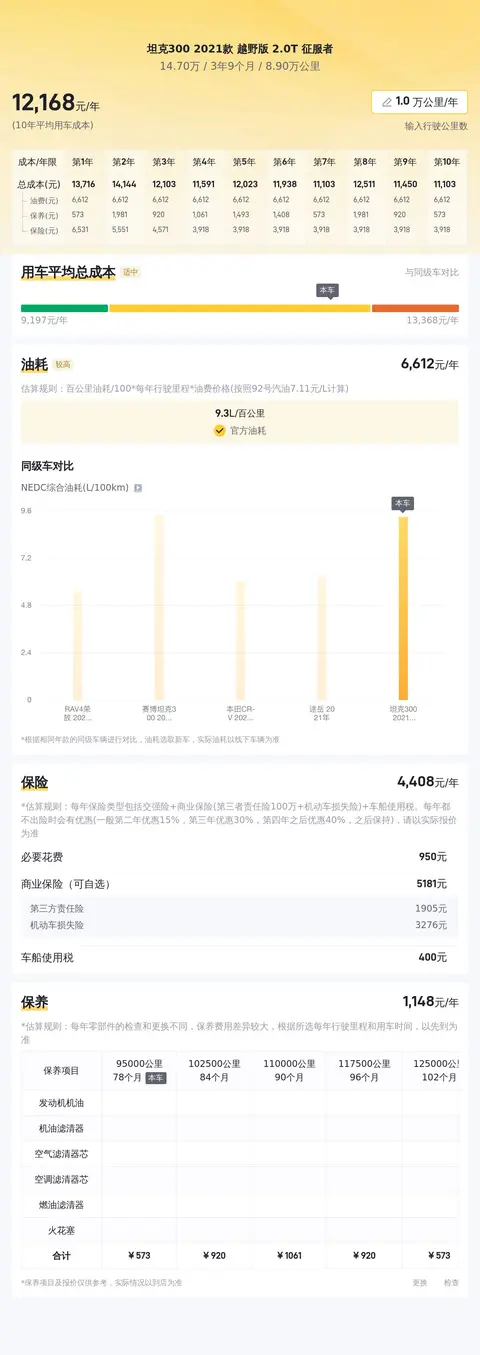 不过,据估算坦克300 2021款 越野版 2.0T 征服者的用车成本较低,因为同级车的最低用车成本是11709元/年,最高是17838元/年,而坦克300 2021款 越野版 2.0T 征服者是12390元/年,所以较低。