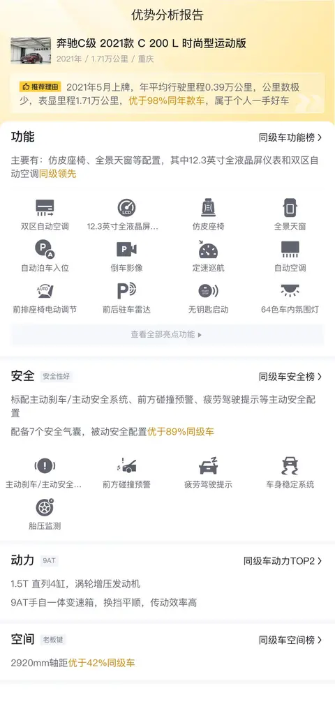 这辆车的优点是报价低于市场行情价,同时本车首付金额较低,入手压力小。外观虽然有轻微瑕疵,但是并不影响车辆的正常使用。内饰配置丰富,尤其是双区自动空调同级领先。奔驰C级作为一款豪华轿车,在品牌、品质、科技感方面有着出色的表现,开出去还是很有面子的。
