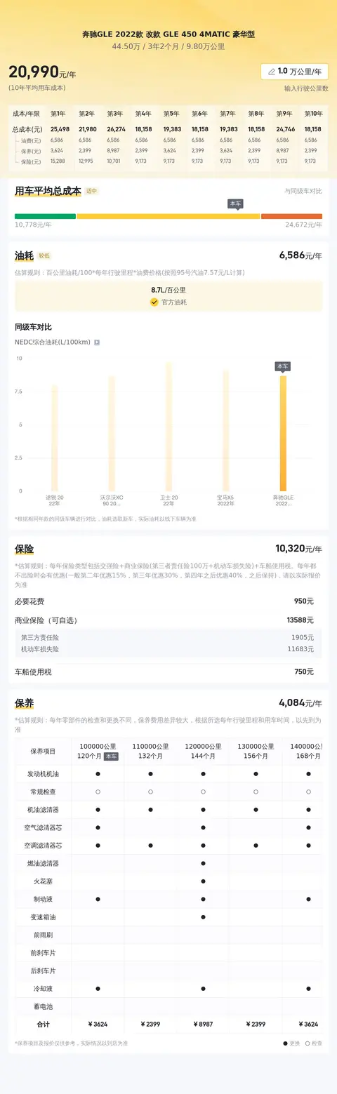 据估算,奔驰GLE 2022款 改款 GLE 450 4MATIC 豪华型的用车成本也相对较高,因为它的用车成本是21246元/年,同级车最低是18144元/年,最高是22983元/年。