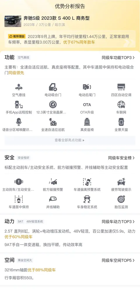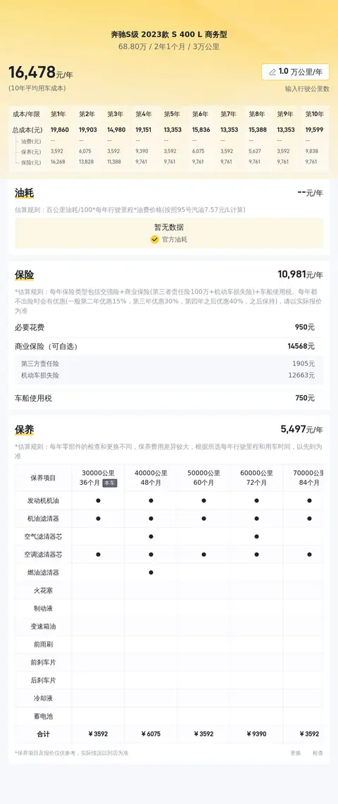 据估算,同级车的最低用车成本是17500元/年,最高是40000元/年,奔驰S级2023款 S 400 L 商务型是33351元/年,用车成本较高。