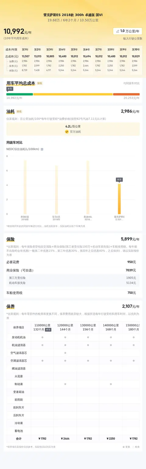 根据当前市场行情,这辆2018款雷克萨斯ES300h卓越版国VI的售价为19.68万元。从用车成本来看,这款车的燃油经济性优秀,百公里油耗仅为4.2升,能够为驾驶者节省大量的燃油费用。同时,雷克萨斯品牌的可靠性和高品质也意味着这款车在维护和保养方面的成本相对较低。因此,从长期使用的角度来看,这款车是一款非常经济实惠的选择。