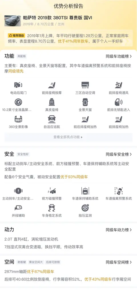 报价低于市场行情,因为帕萨特 2019款 380TSI 尊贵版 国VI的市场行情价是11.75万-14.55万,它的报价则是10.98万,价格上有很大优势,同时保值率也较高。