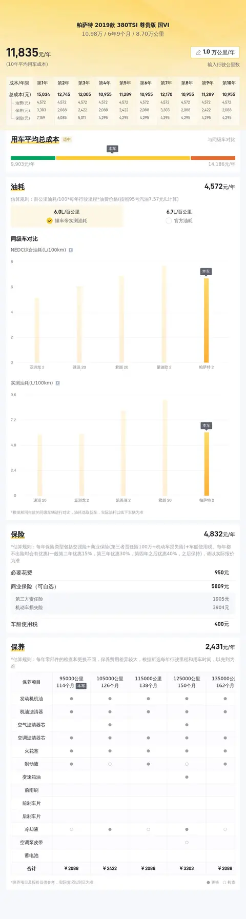 据估算,帕萨特 2019款 380TSI 尊贵版 国VI的用车成本较低,因为同级车的最低用车成本是6141元/年,最高是12050元/年,而帕萨特 2019款 380TSI 尊贵版 国VI的用车成本是6950元/年。