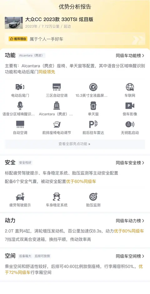 综合来看,这辆2023款大众CC 330TSI 炫目版在动力性能、配置丰富度以及舒适性方面都有着不错的表现,尤其是在语音控制和电动尾门方面的配置,领先同级。作为一款二手车,它的售价相比新车有一定的优惠,对于想要购买一款高品质B级车的消费者来说,它是一个值得考虑的选择。