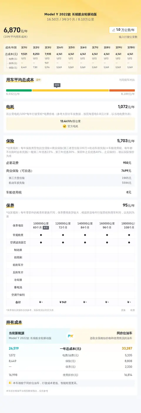 据估算,Model Y 2022款 长续航全轮驱动版的用车成本是8069元/年,同级车最低是5606元/年,最高是8961元/年,所以用车成本偏高。
