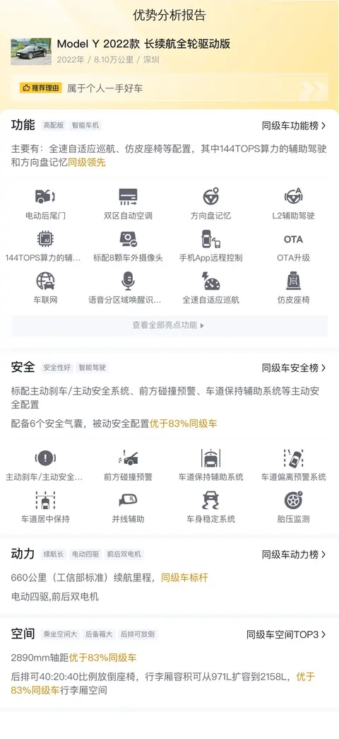 优势:Model Y作为全球销冠车型,市场欢迎度极高,而且这款是长续航版本,续航660公里,基本没有续航焦虑。空间大,适合一家五口使用。配置丰富,基本上涵盖了日常所有驾驶场景。而且电动车驾驶感受好,平顺安静,并且提速快,是一款不可多得的好车。