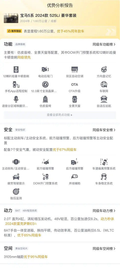 买二手车,配置不在于多,而在于要实用。这辆宝马5系 2024款 525Li 豪华套装配备了12喇叭哈曼卡顿音响、全景天窗、L2辅助驾驶、疲劳驾驶提示等配置。
