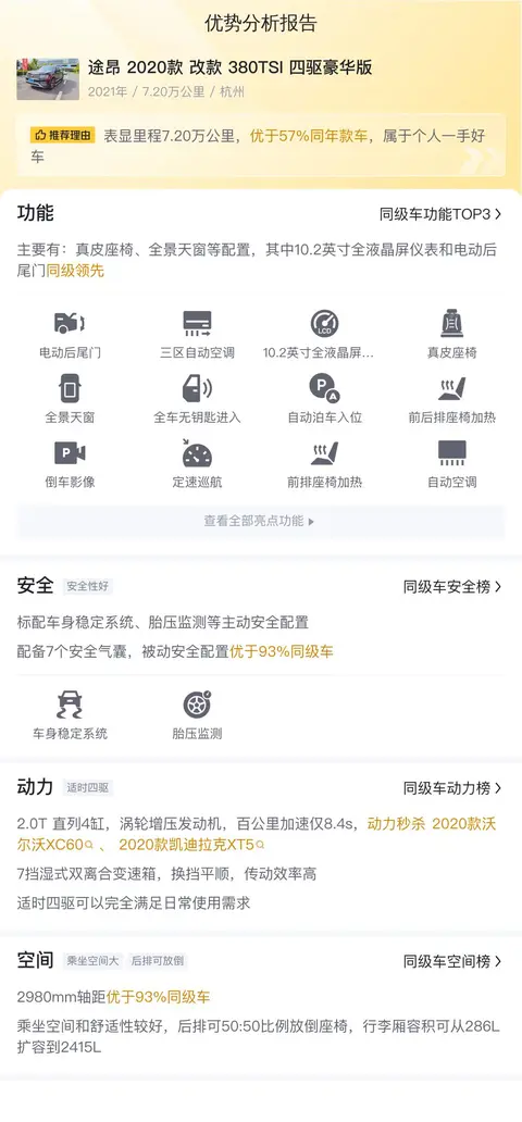 这辆途昂 2020款 改款 380TSI 四驱豪华版是一款值得考虑的二手车选择。它拥有良好的车况、丰富的配置和出色的性能,适合家庭用车和长途旅行。考虑到其合理的价格和较低的用车成本,这辆车对于寻求高品质驾乘体验的消费者来说,无疑是一个不错的选择。当然,在购买二手车时,建议买家亲自到场查看车况,确保车辆符合个人需求和预算。