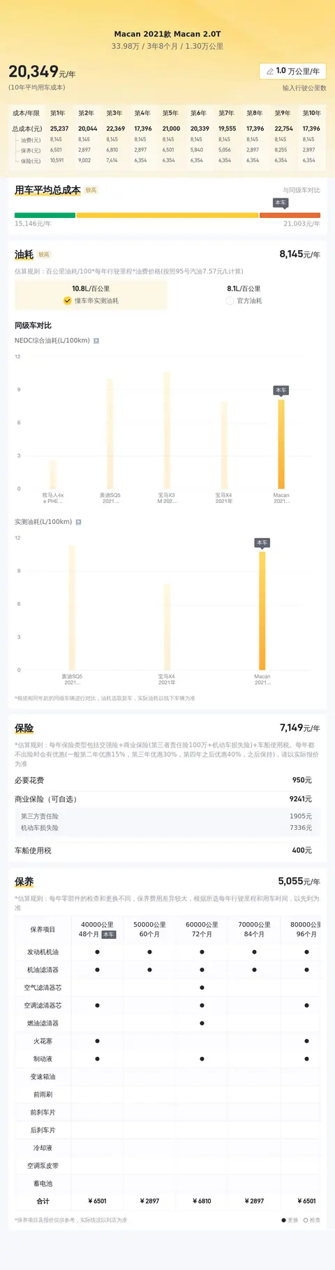 保时捷Macan的用车成本受到多种因素的影响,包括保险费用、保养费用、燃油消耗等。根据相关数据显示,Macan的年度商业保险费用大约在11,779元左右,这一费用会随着保险方案的不同和个人驾驶记录的变化而有所调整。年度保养费用大约在5,188元左右,具体费用视保养项目和所用材料而定。此外,Macan作为一款高性能豪华SUV,其燃油消耗相对较高,年度燃油费用可能达到13,780元左右,这一费用会根据驾驶习惯和油价波动而变化。综合考虑,保时捷Macan的年度用车成本大约在30,747元左右。然而,实际用车成本可能会因个人使用习惯、车辆状况和地区差异等因素而有所不同。