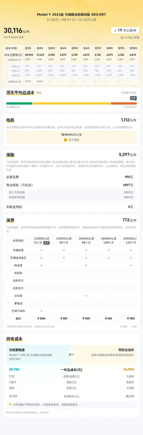 据估算,Model Y 2021款 长续航全轮驱动版 3D3/3D7的用车成本是6905元/年,同级最低是5683元/年,最高是10401元/年,所以它的用车成本适中。