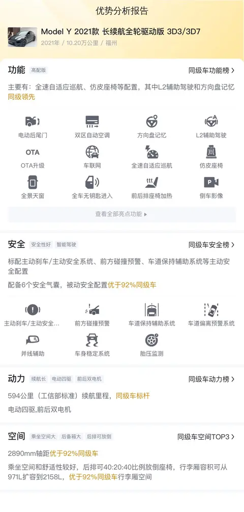全球销冠的纯电SUV,Model Y确实有它的魅力,不过也存在着很多纯电车的通病,尤其是特斯拉近期自燃事故频发,让人对它的安全性产生了怀疑。这辆Model Y 2021款 长续航全轮驱动版 3D3/3D7价格不高,配置丰富,空间宽敞,动力也很强,适合长途旅行和家庭使用。不过也要考虑到自燃风险、电池衰减、续航里程等问题,在购买时要全面评估。
