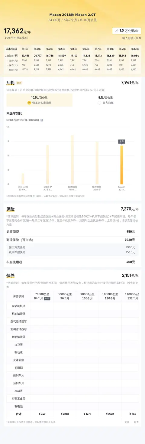据估算,Macan 2018款 Macan 2.0T的用车成本是17173元/年,同级车最低是17173元/年,最高是23946元/年,所以它的用车成本较低。