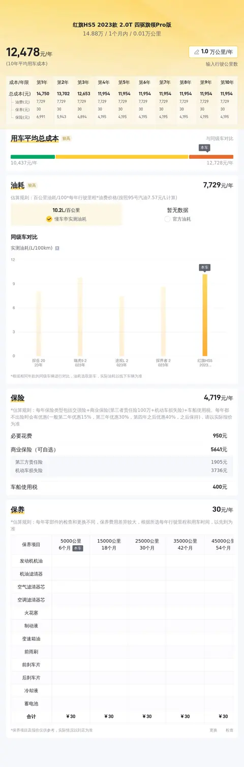 根据懂车帝的数据,这辆红旗HS5 2023款 2.0T 四驱旗领Pro版的售价为14.88万元,在当前车况下具有较高的市场竞争力。从用车成本角度来看,按照每年行驶2万公里计算,10年平均用车成本约为13168元/年,相较于同级别车型而言,这一成本处于合理范围内。需要注意的是,实际用车成本可能会根据用车频率、燃油价格等因素有所变动。