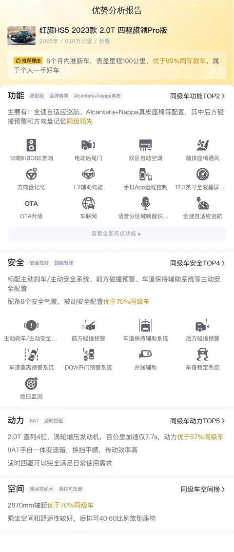 综上所述,这辆二手红旗HS5 2023款 2.0T 四驱旗领Pro版在车况、配置、性能等方面均表现出色。作为一款定位于年轻消费群体的中型SUV,红旗HS5以其时尚的外观、丰富的配置和合理的价格赢得了市场的认可。对于正在寻找高性价比二手车的消费者来说,这辆红旗HS5无疑是一个值得考虑的选择。然而,购买二手车时务必谨慎对待,建议潜在买家在决定购买之前,向懂车帝申请专业的第三方检测服务,以确保车辆的实际状况与卖家的描述相符。毕竟,购买决策应该基于全面、准确的信息,以保障自身的权益和用车体验。
