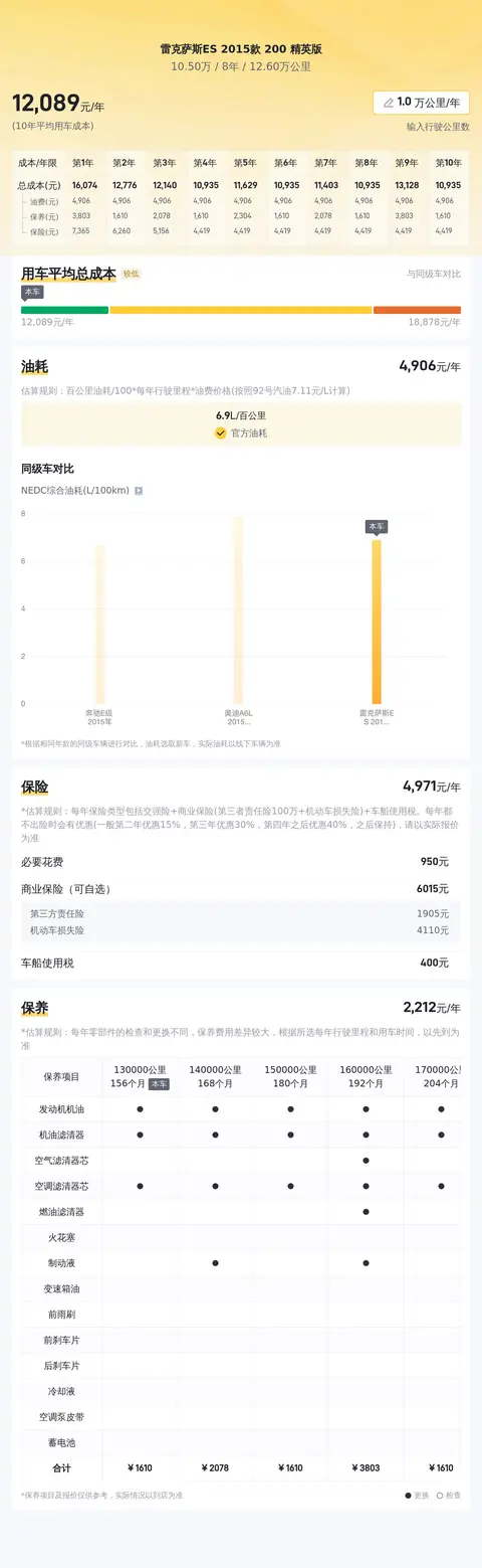 据估算,雷克萨斯ES 2015款 200 精英版的用车成本是12053元/年,同级车最低是10800元/年,最高是21378元/年,所以它的用车成本偏低。