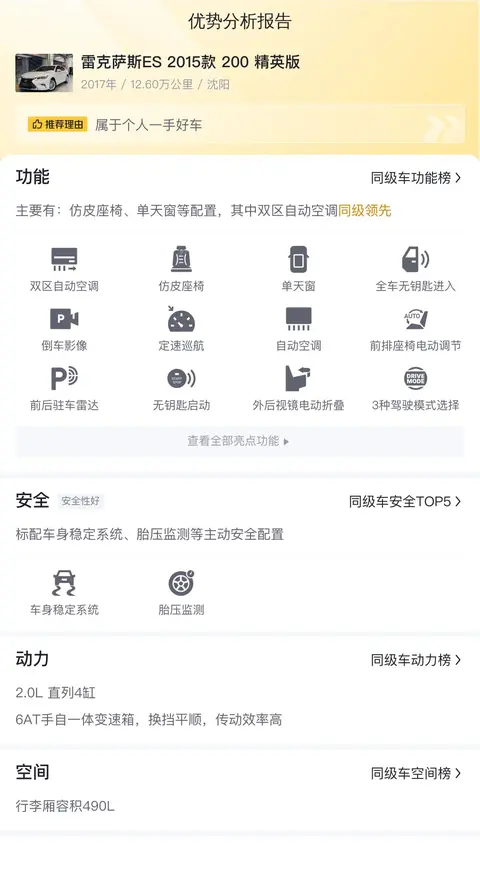 优势方面,这台雷克萨斯ES 2015款 200 精英版的舒适性配置丰富,配备10个安全气囊,被动安全配置优于75%同级车。并且标配车身稳定系统、胎压监测等主动安全配置,作为家用来说,安全性足够。