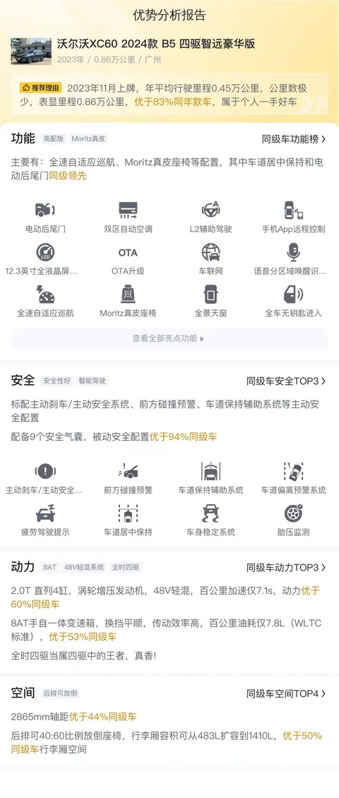 这款沃尔沃XC60 2024款 B5 四驱智远豪华版上牌时间为2023年11月,上牌地车源地均为广州,过户次数为0次,表显里程为8600公里。新车指导价为42.59万,而现在的二手车报价为22.8万,相比新车省19.79万。