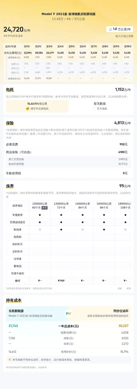 据估算,Model Y 2021款 标准续航后轮驱动版的用车成本是2509元/年,同级车最低是1117元/年,最高是4871元/年,所以它的用车成本偏低。