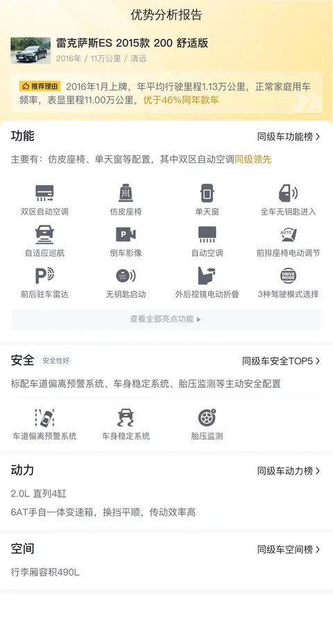 综上所述,这款雷克萨斯ES 2015款 200 舒适版在配置、安全、动力、空间方面都表现出色,尤其在配置和安全方面更是优于57%的同级车型,是一款值得推荐的二手车。