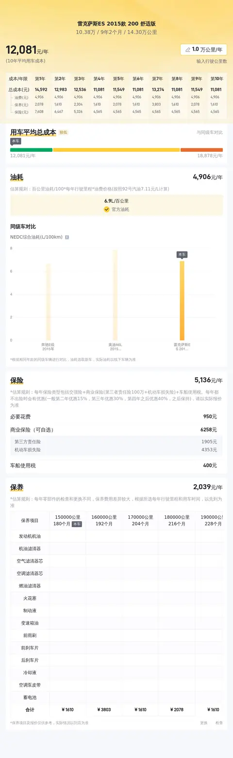 雷克萨斯ES 2015款 200 舒适版的10年平均用车成本是12353元/年,同级车的最低10年平均用车成本是11601元/年,最高是16798元/年,所以雷克萨斯ES 2015款 200 舒适版的用车成本适中。