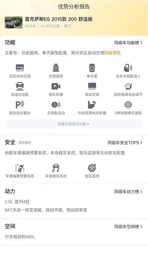 这辆雷克萨斯ES 2015款 200 舒适版优势方面,首先,雷克萨斯ES以其卓越的品质和精致的做工赢得了广泛赞誉,这一声誉为其带来了较高的品牌认可度。其次,车辆提供了宽敞的内部空间和舒适的乘坐体验,非常适合家庭使用和商务出行。再次,雷克萨斯ES注重细节处理和内饰材质的选择,营造出一种豪华且温馨的氛围。此外,车辆搭载的发动机在保证充足动力的同时,也考虑到了燃油经济性,既环保又经济。最后,ES系列配备了多种先进的安全技术,为驾乘者提供了全方位的安全保障。