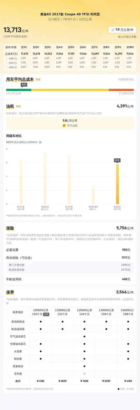 据估算,同级车的最低用车成本是13788元/年,最高是17786元/年,奥迪A5 2017款 Coupe 40 TFSI 时尚型是14184元/年,用车成本适中。