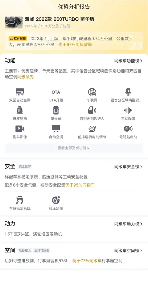 综上所述的新车含税价、用车成本、市场行情、优势分析、同款比价等数据仅供参考。在配置部分,因为二手车非标品,车辆可能会存在配置改装的情况,具体车况信息需要线下结合车辆实际情况进行综合参考。