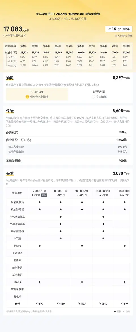 这辆车10年平均用车成本约为17185元/年,与同级车相比处于中间值。